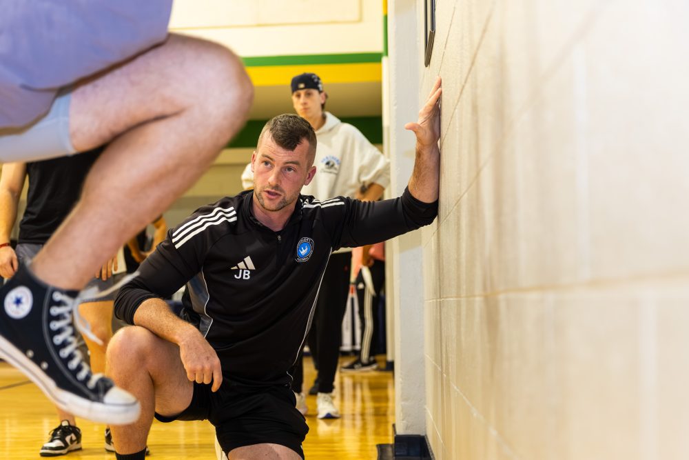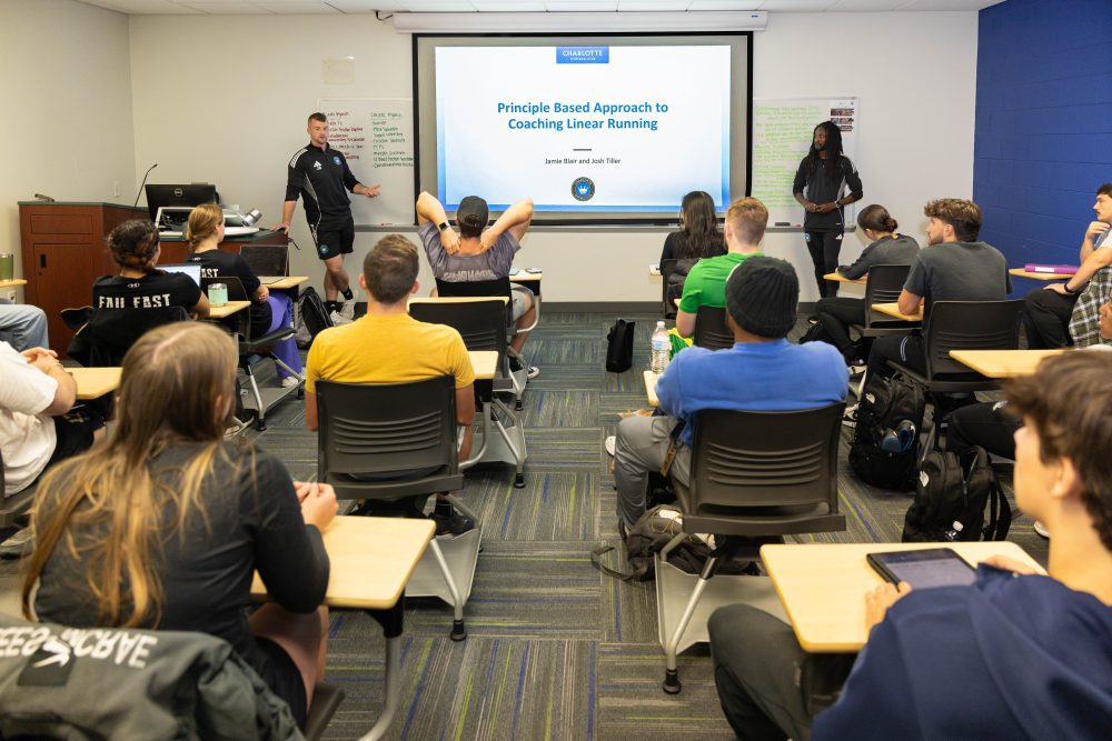 Jamie Blair, a performance coach with Crown Legacy, the reserve team of Charlotte FC, and UNC Charlotte alum Josh Tiller ’24, a Master of Kinesiology graduate who serves as assistant performance coach for Charlotte FC’s Academy, the team’s full-time youth development program, presented a workshop on the Principle-based Approach to Coaching Linear Running.